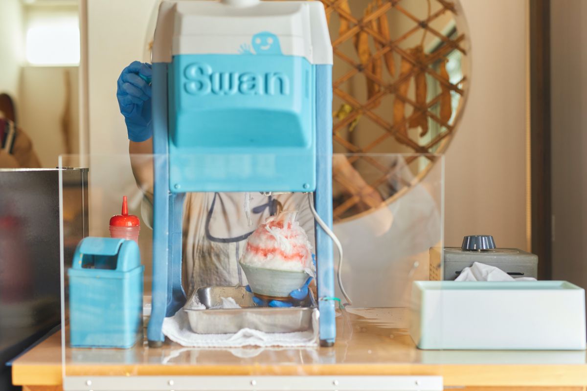 お客さんを出迎えるかのように、Swanのかわいらしい水色のかき氷機が設置され、この場でかき氷を作っています。ひらひらと削った氷が皿に落ちていく様子が涼しげで、吸い込まれるように店内へ。