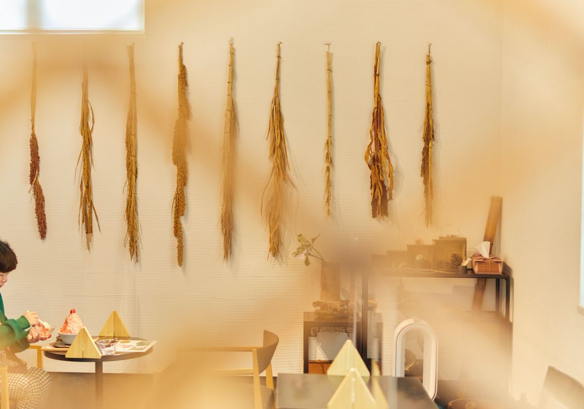 和を基調とした落ち着いた店内。白壁に吊るされた雑穀たちがインテリアの一部として溶け込んでいます。