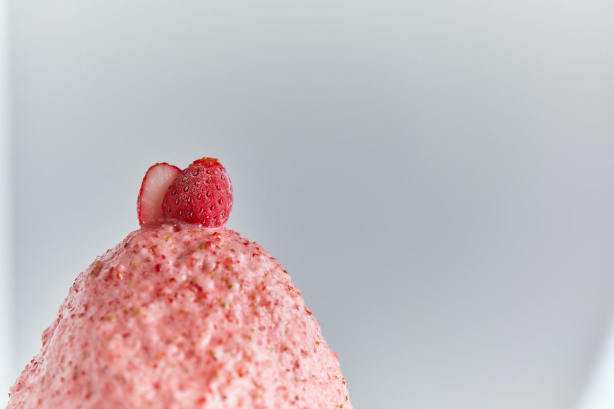 近くまで寄って、このシロップに使われているいちごの量の多さ、みずみずしさを感じてください。使われているいちごは、知り合いのおじいさんが丹精を込めて育てた甘いいちご。種の粒々まで新鮮です。
