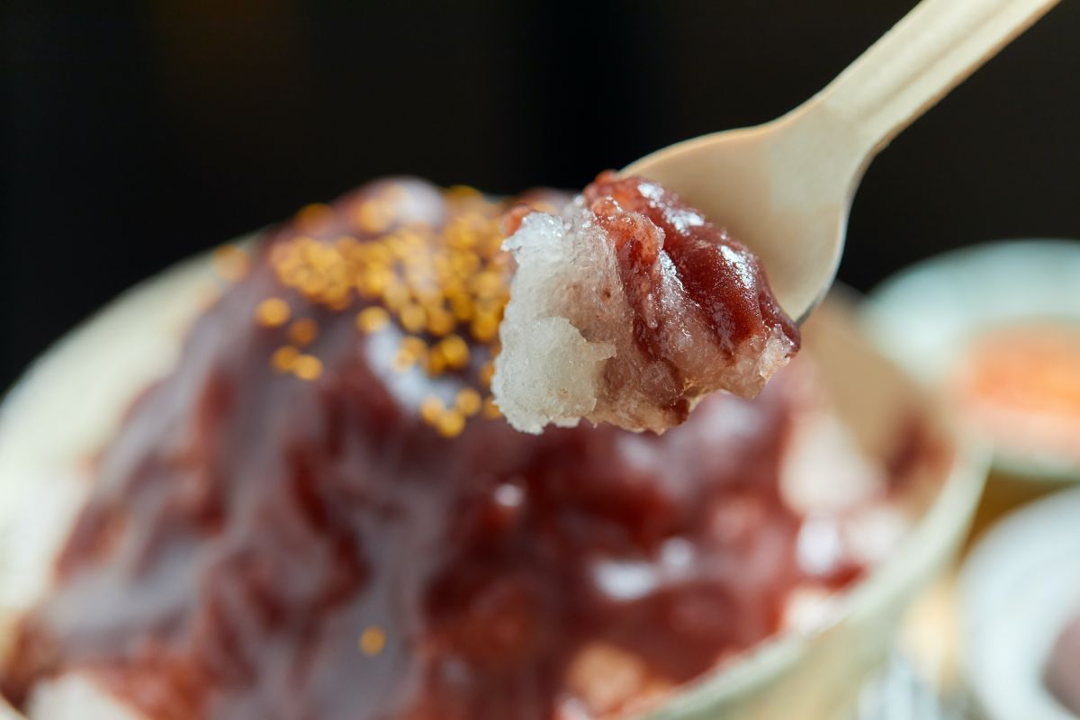 見て!シロップがあんこ。白くてふわふわの氷とトロ~リ甘いあんこのシロップを一緒に食べると、まるで伊勢の赤福を食べているかのよう。小豆をしんなりと炊いて、丁寧に裏ごししてあります。