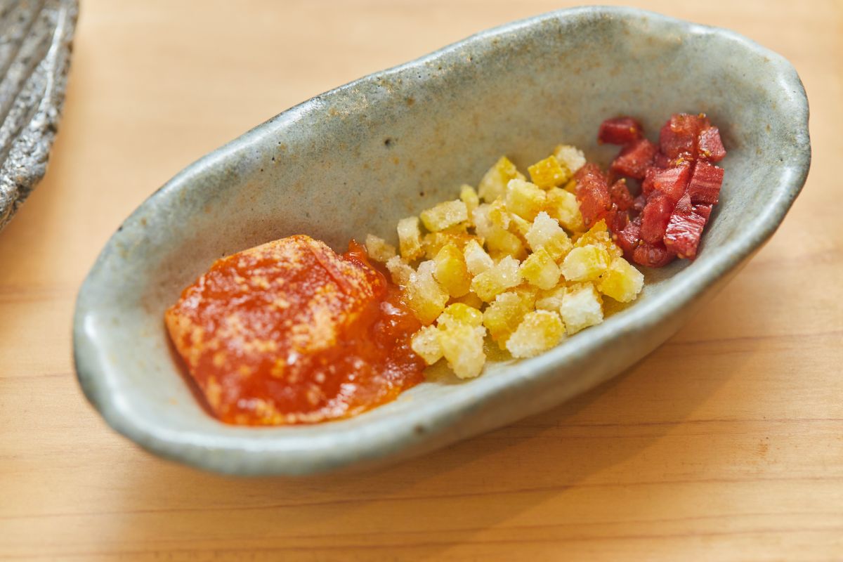ごはんでいえばお漬物のように添えられているのが、自家製ドライフルーツ。左から吉野の柿、御所の夏みかんのピール、大和郡山のいちご。このドライフルーツがもたらす味の変化が劇的で、驚き。フルーツ大福で、あんことフルーツの相性の良さは実証済みですが、ドライフルーツとあんこもめちゃくちゃ合います。目からウロコのおいしさです。
