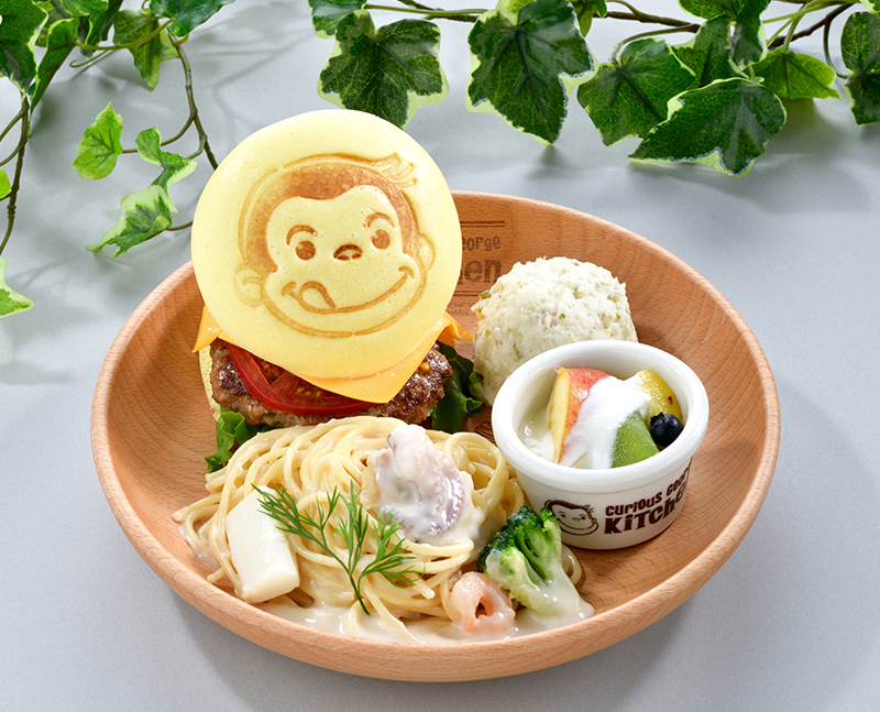 人気のメニューもセカンドシーズンで新しくなりました!「『店長のおすすめ!!』よくばりバーガー&パスタプレート」1680円はパスタをシーフードクリームパスタに変更。ジョージのお顔のふわふわバンズのハンバーガーと、パスタ、ピクルス入りのスペシャルポテトサラダにデザートまで!おなかいっぱい、大満足なひと皿です。
