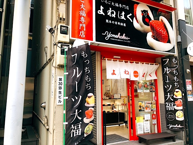 「いちご大福専門店 よねはく」は、熊本市の老舗餅屋よねはくがプロデュースするいちご大福専門店。熊本県産餅米のみを使った餅に、甘さ控えめの餡、さらに大粒の熊本県産ブランドを中心に選び抜いたいちごを包んでいます。