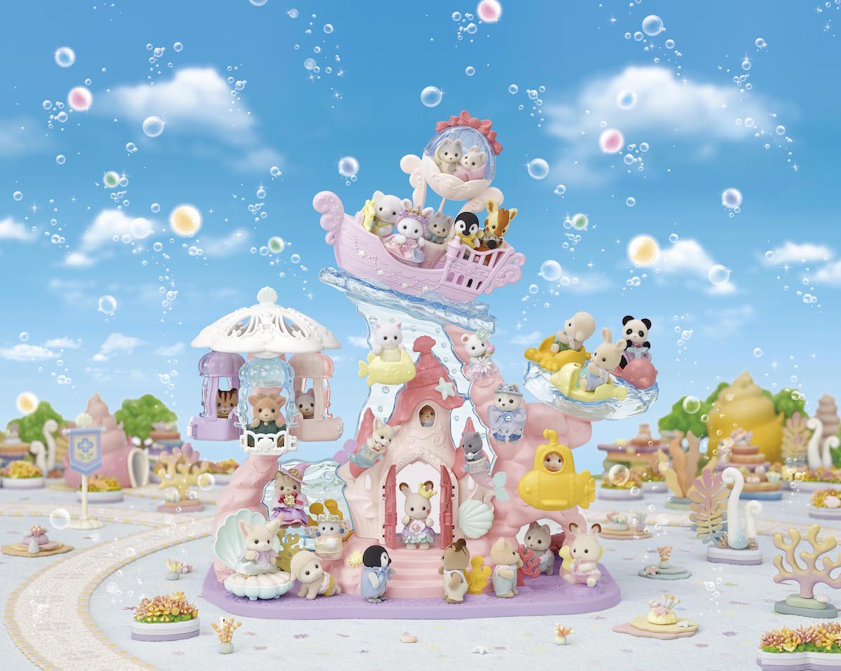 「ゆめいろマーメイドキャッスル」は2020年4月から好評を博している「シルバニアファミリー ゆうえんちシリーズ」の最新作。海がテーマのゆうえんちで、マーメイドキャッスルやアクアゴーラウンド、くらげのブランコなど、赤ちゃん人形で遊べる楽しいアトラクションが12種類あるほか、マーメイドモチーフのかわいい衣装を着た赤ちゃん人形3人がセットになっています。