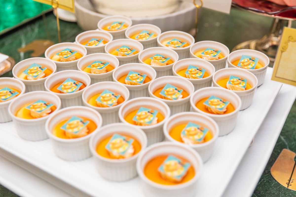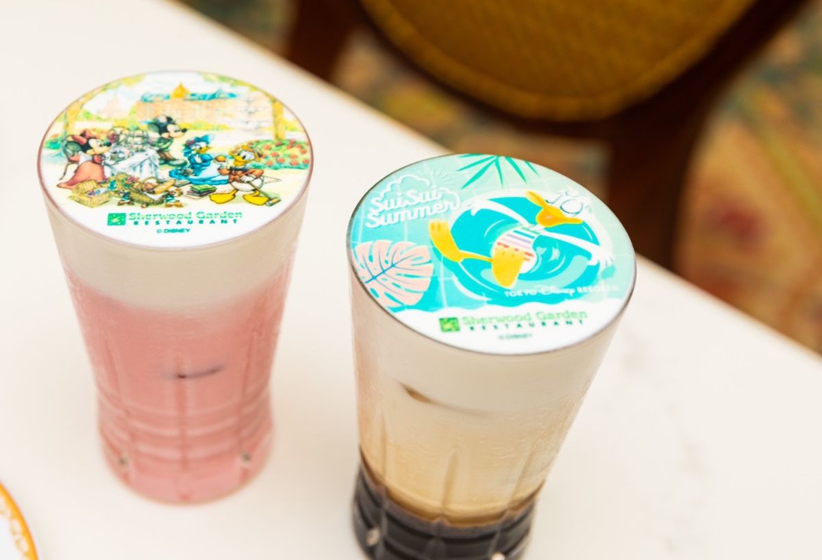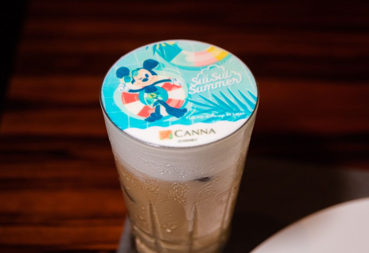 ランチブッフェには+1800円でマジカルアートドリンクのオーダーもOK。アイスキャラメルラテとアイスストロベリーミルクの2つの味が選べ、デザインも“東京ディズニーランドホテル”デザインのほか、ドナルドが気持ちよさそうに浮き輪に乗っているイラストの“サニーサマーダイニング”デザインも選べます。