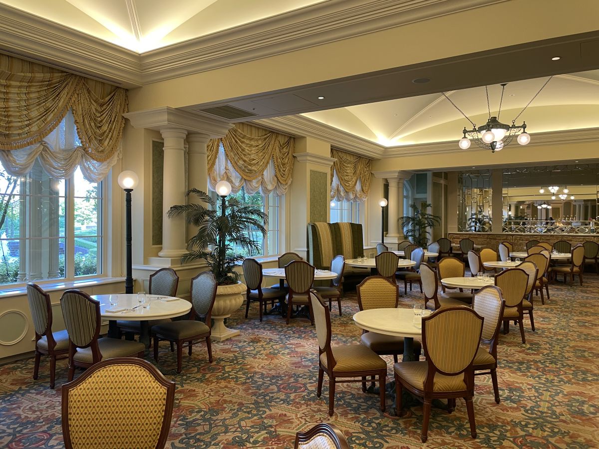 お庭に面した広いスペースのレストラン。298席もあり、窓が大きくとられているので、日中は明るい雰囲気。ミッキー&フレンズ・スクエアやシャーウッドガーデンも眺められます。