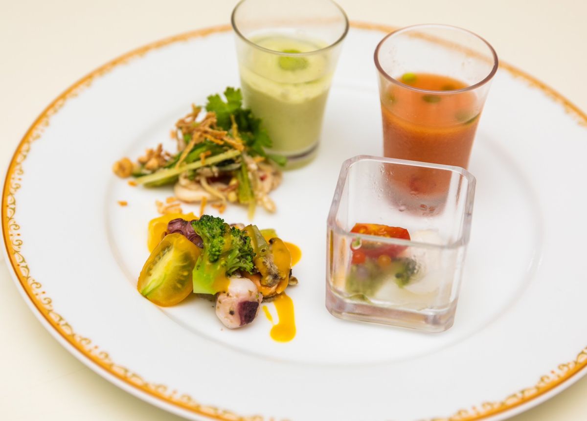 見た目も美しい前菜は夏野菜と昆布締めしたハタを使ったメニュー。軽くあぶられたハタは身がきゅっとしていて、美味。カボスやすだち、大葉のピュレで夏らしいさわやかな味わいが◎。