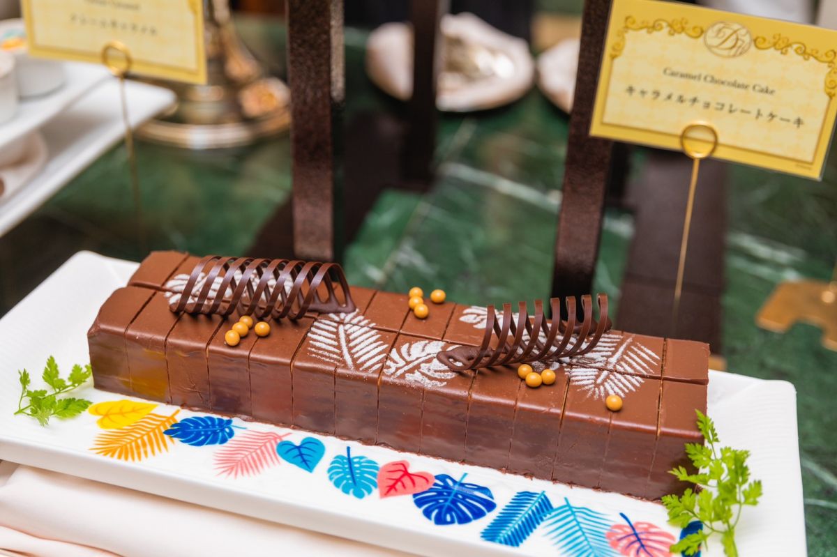 フィナンシェの生地で土台を作っていて、中にはイチジクのコンフィが。イチジクのつぶつぶ食感も楽しいデザートです。バジル入りのパインソースも味のアクセントに。モンスラの葉をデザインしたチョコレートで亜熱帯のリゾート感を演出しているのだとか。