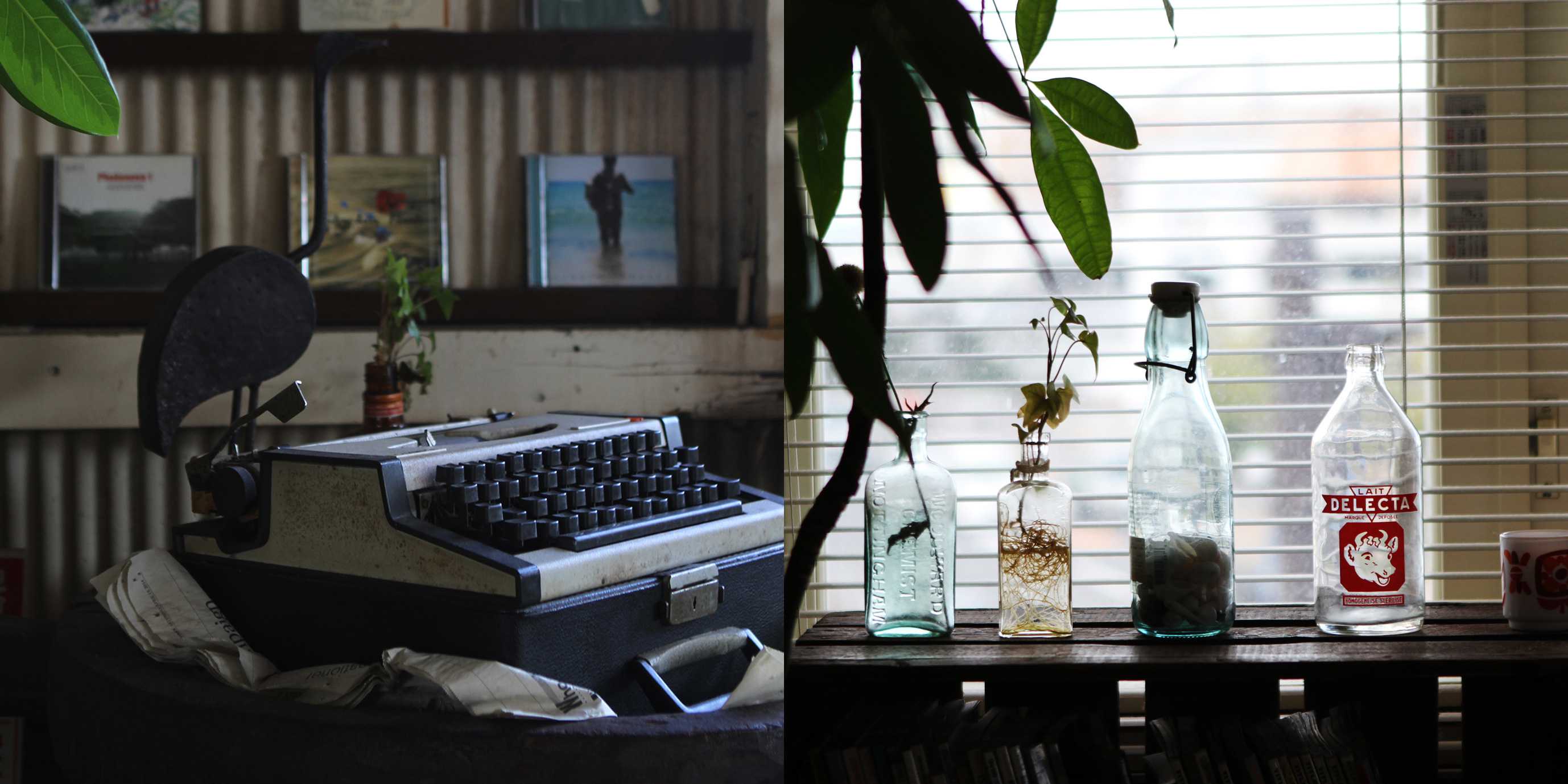 デザイナーのセンスで集められたソファやテーブルなどのインテリアは、一見ちぐはぐなテイストながらも無骨な倉庫と不思議と調和しています。窓辺にさらりと置かれたアンティークの小瓶、壁に吊されたドライフラワー、レトロなタイプライター…。小さな雑貨ひとつひとつがかわいくて、どこを切り撮っても絵になります。