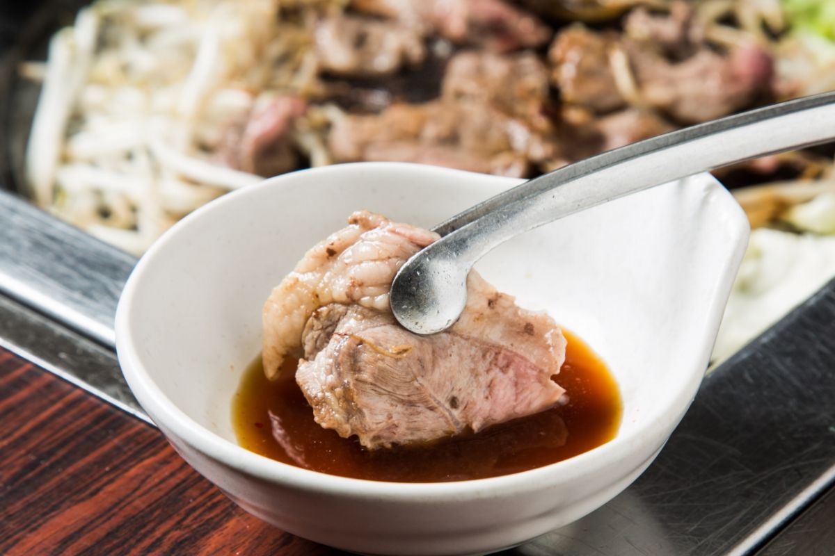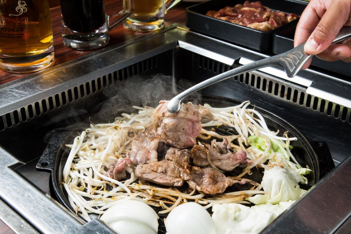 お肉のふちが白くなってきたら裏返し、全体が白くなり焼き色がついたら食べごろ。モヤシやタマネギなど野菜と一緒にどうぞ。
