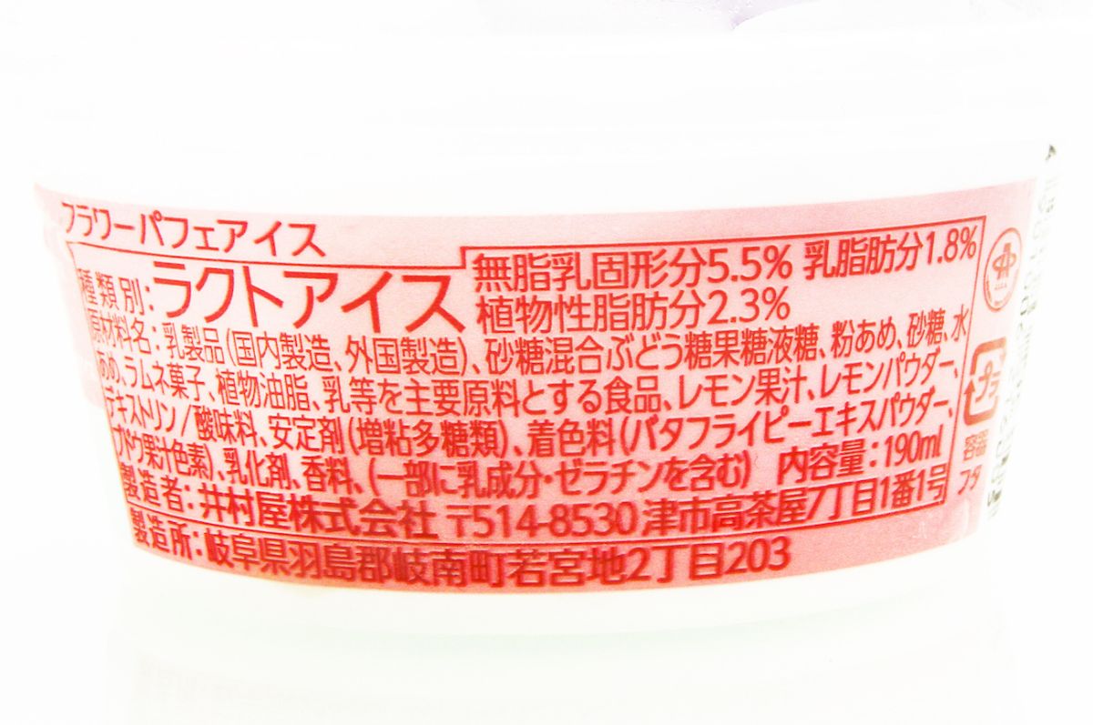 この夏発売された4種のコラボアイスのなかでも、最も印象的なのがこのフラワーパフェアイス。ドーム型フタ付きのカップアイスで、存在感のある花形が半透明のフタから透けて見えます。フタに書かれた「バタフライピーとレモンパウダーの反応による色のグラデーションをお楽しみください」とは、どういうことなのか気になりますね。