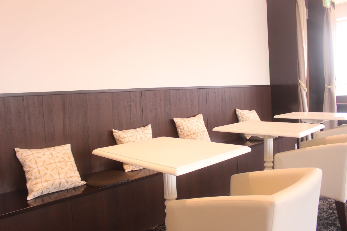 店内は壁や注文カウンター、テーブルやイスを白で統一し、ブラウン調のカーぺットがシックな雰囲気。近くに高い建物が少ないので、窓の外には青空が広がる眺望も開放的で素敵です。