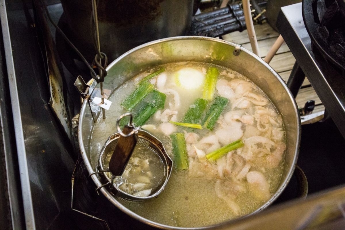 スープのベースには豚のゲンコツや背骨、香味野菜、鶏を使っており、3時間ほど煮出してから別の寸胴でとったスープを継ぎ足すことで濃度を調整します。