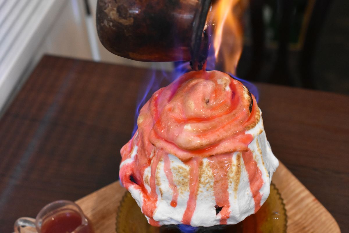 ここからなんと、間近で一気にフランベ!かき氷にかけているのは、さくらんぼのリキュールにラズベリーのエキスを混ぜたシロップ。こんなに壮大なかき氷、見たことありません!
