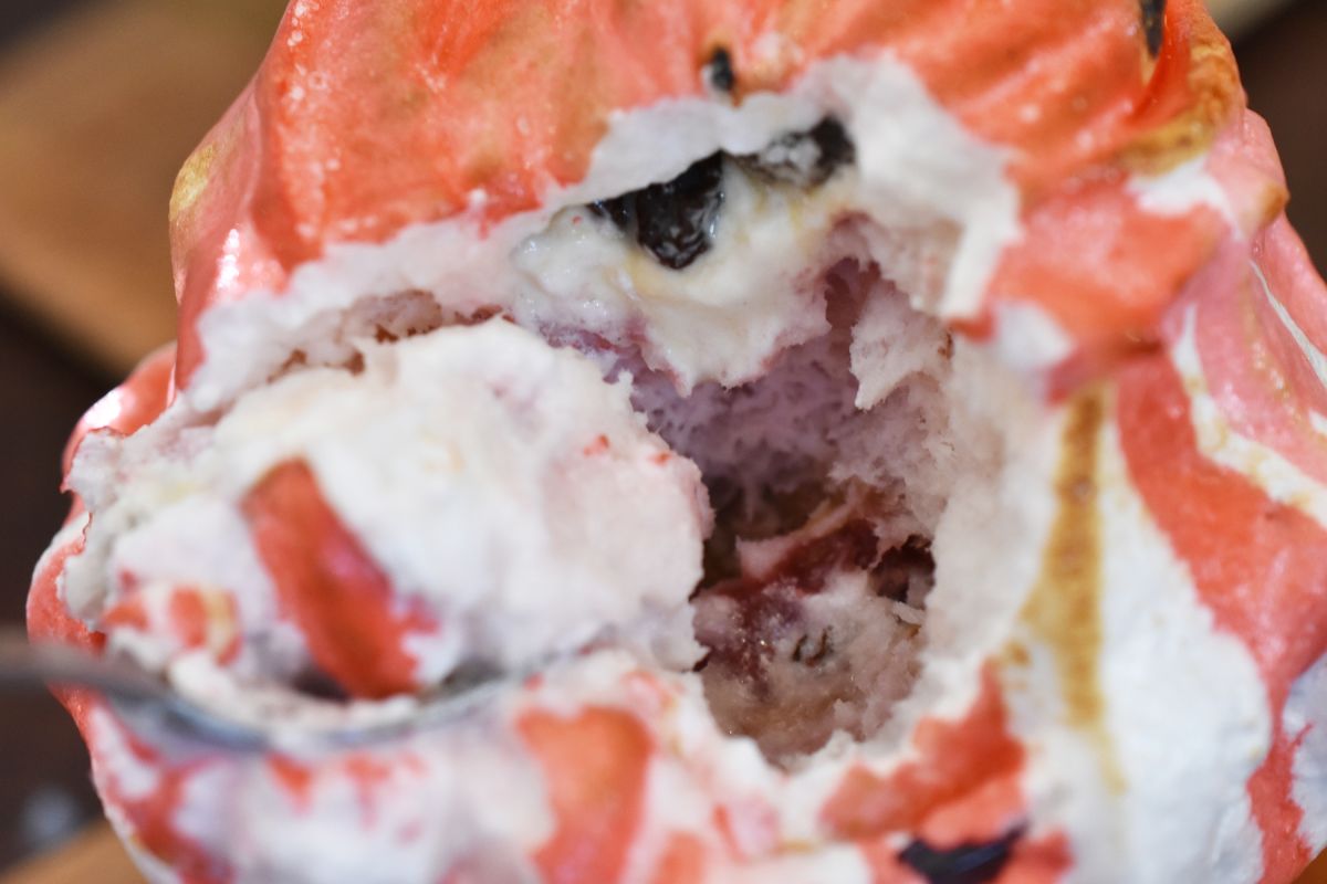 かき氷の内側は、いちごシロップやクリームチーズ、マスカルポーネクリームなどが層になっていて、自家製のラムレーズンがたっぷり入った大人味!トッピングには、キャラメルのほかに東京・三鷹の無添加ジャム工房「Mi Jam(ミジャム)」の薔薇が香るフルーツジャムが添えられているので、味変しながら楽しめちゃいます。
