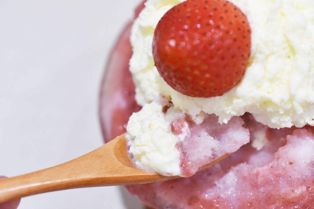 いちごのおいしさをぎゅっと詰め込んだシロップと、ほどよい甘さのホイップを合わせれば、ひんやり冷たいショートケーキの味わいに。天然氷を使用することで、硬く凍った氷が薄く削れるため、食感もふわふわになるんです♪ 夏場はかなり溶けやすいので、提供後は早めに食べるようにしましょう!