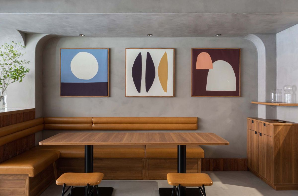 奥のソファ席の壁には、ごまにちなんだ3つのアートが! 左から、太陽、ごま、アフリカの大地を表現しているのだそう。
