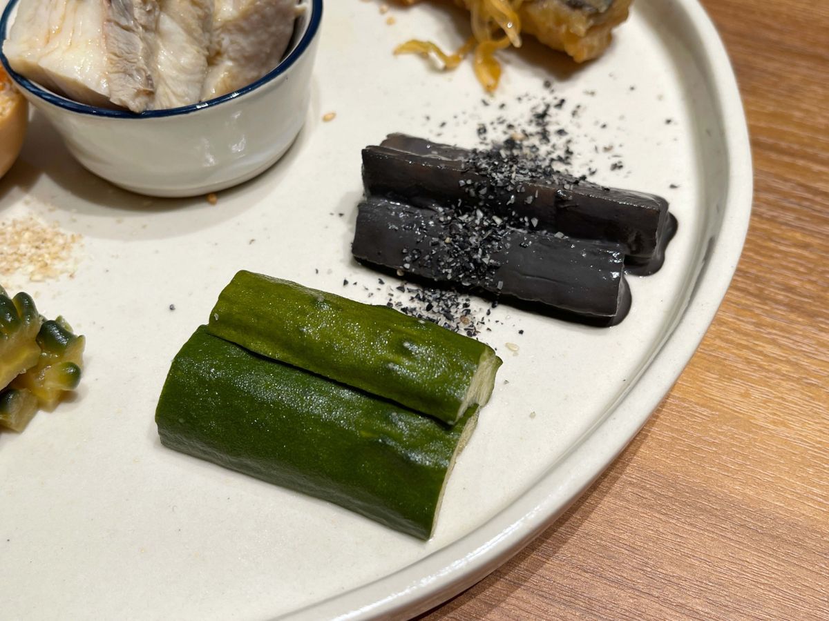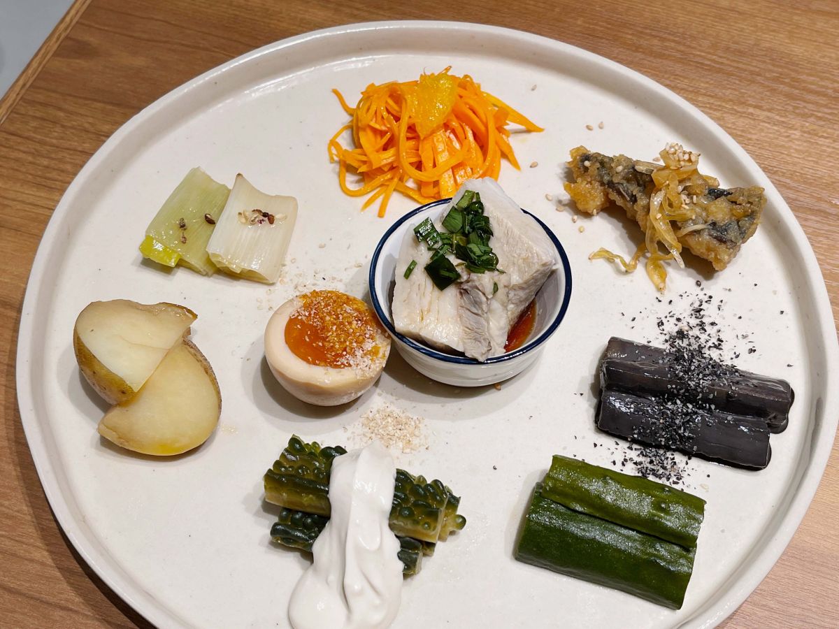 取材時(※2022年7月時点)のメニューは、「スチームドポーク」「ネギのコンフィ」「キャロットラペ」「ごぼう 黒ごま和え」「新じゃがの焚き物」「小魚のエスカベッシュ」「半熟卵 らー油すりごま漬け」「ゴーヤ・キウイ ねりごま豆腐ソース」「ごま油ピクルス」の9品。(※食材の仕入れ状況により変更になる可能性あり)