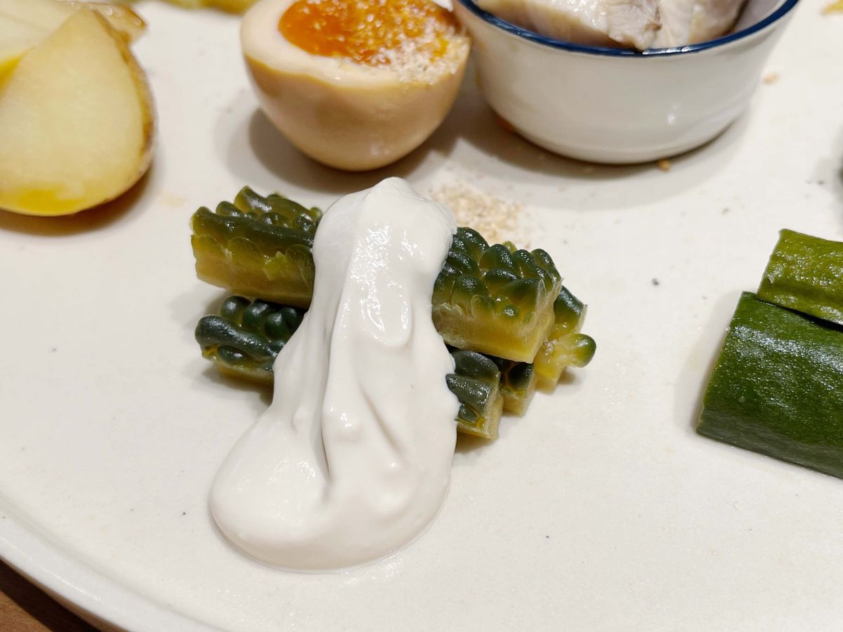 夏らしい「ゴーヤ・キウイ ねりごま豆腐ソース」は、ゴーヤの苦みに、豆腐と練りごまのソースがまろやかな口当たり。ほんのりとだしの味も利いていて、ほかにない味わいを楽しめます。