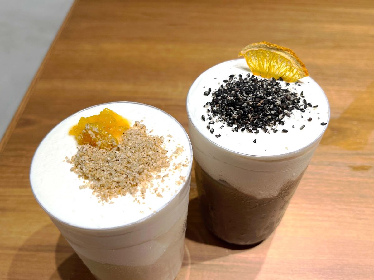 ドリンクでも、ごまを堪能できるメニューがたくさん。今回は、「goma to」定番ドリンクの「黒ごまチョコレートラテ」と、「白ごまマンゴーラテ」をチョイス! 写真はどちらもアイスですが、ホットの用意もありますよ。
