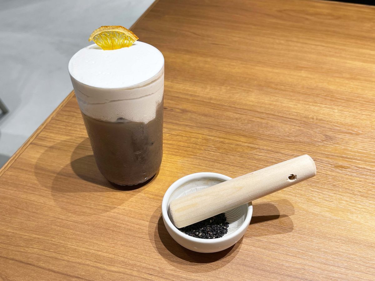 「黒ごまチョコレートラテ」は、黒ごまとオーツミルクがベースのラテ。どちらも濃厚で層が分かれているので、ミルククリームをしっかり混ぜて飲むのがおすすめ。