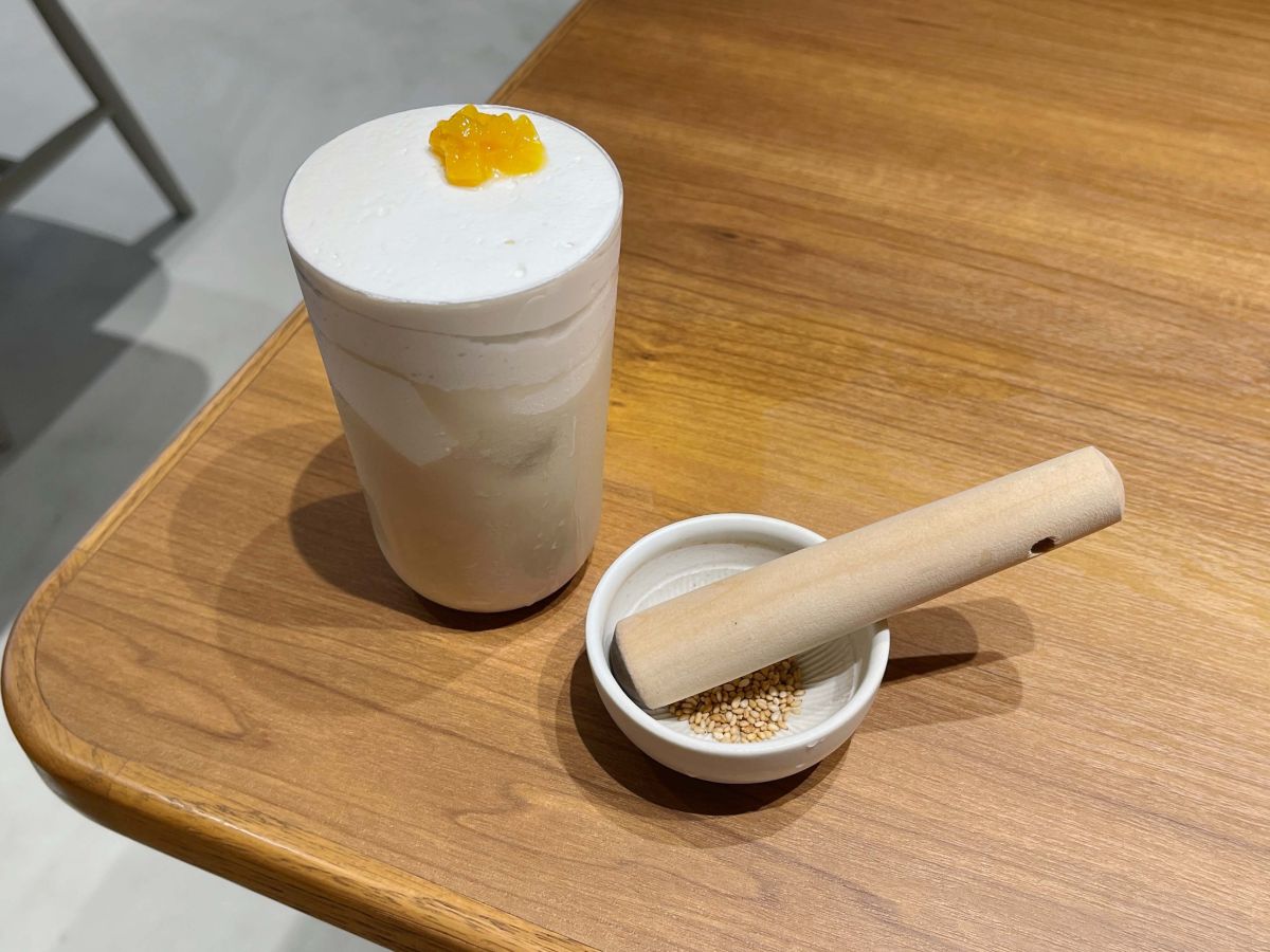 白ごまとオーツミルクをベースにした「白ごまマンゴーラテ」は、マンゴーとシナモンが入っていて、まさに飲むデザート感覚。ごまはナッツに近い風味なこともあり、南国風の味わいに。意外にもマンゴーとマッチするんです!