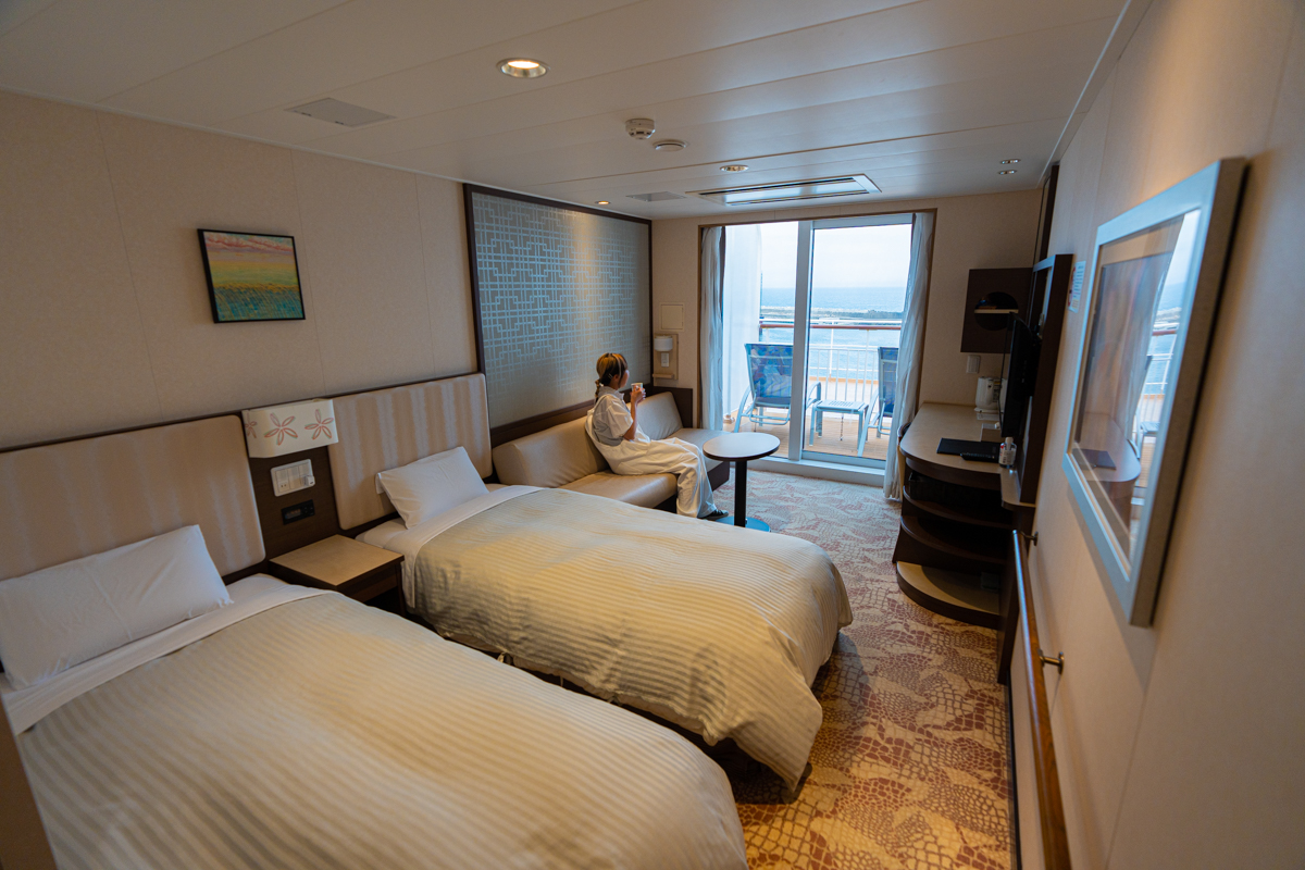 客室にはバルコニーがついていて、船旅中ずっと海が眺められる贅沢さ!夏はチェアやテーブルが設置されるので、腰かけて友人とゆっくりおしゃべりも。心洗われる時間を過ごせました♪