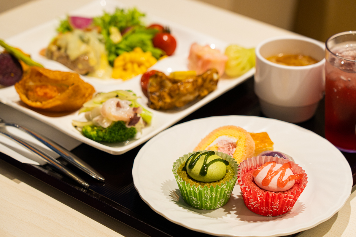 私はハンバーグをメインに、和洋食どちらも食べたかったので、カラフルないなり寿司やスパイシーなチキン……ちょっと欲張ってスイーツまで盛り盛り!一品一品が本当においしくて、おうちの近所にもあればいいのに……。またいつかフェリー旅をして、このビュッフェを楽しみたいです♪