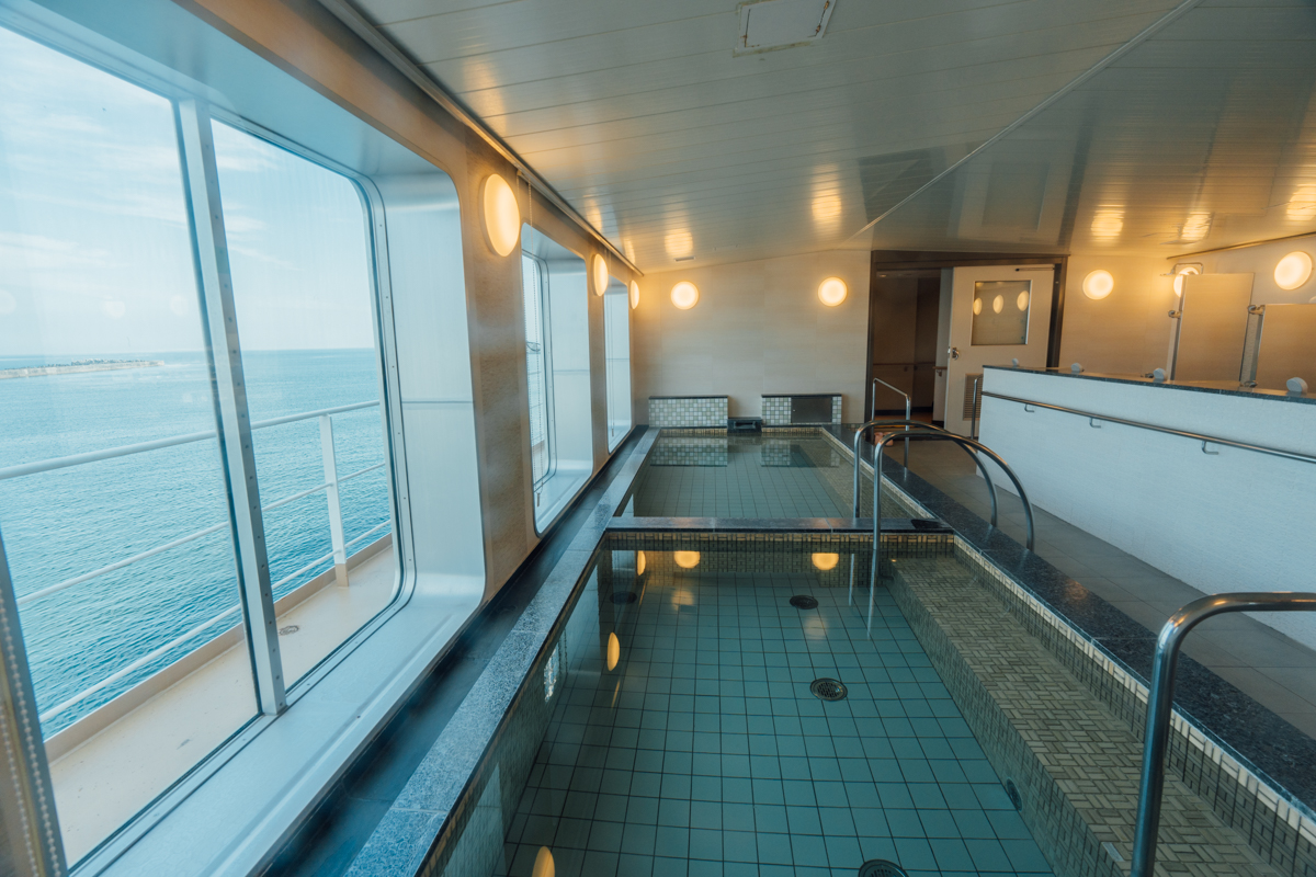 お腹いっぱいになって、お部屋でくつろぐ前にお風呂へ。実は、今回のフェリー旅について調べていたとき、展望浴場があると知って、ワクワクが止まらないぐらい楽しみにしていたんです♪お湯に浸かりながら水平線を眺めるという不思議な体験。大きいお風呂に浸かるだけでも癒やされるのに、目の前に広大な海というシチュエーションが素敵すぎて、気付けば何分が経ったのか。少しのぼせてしまいました(笑)。