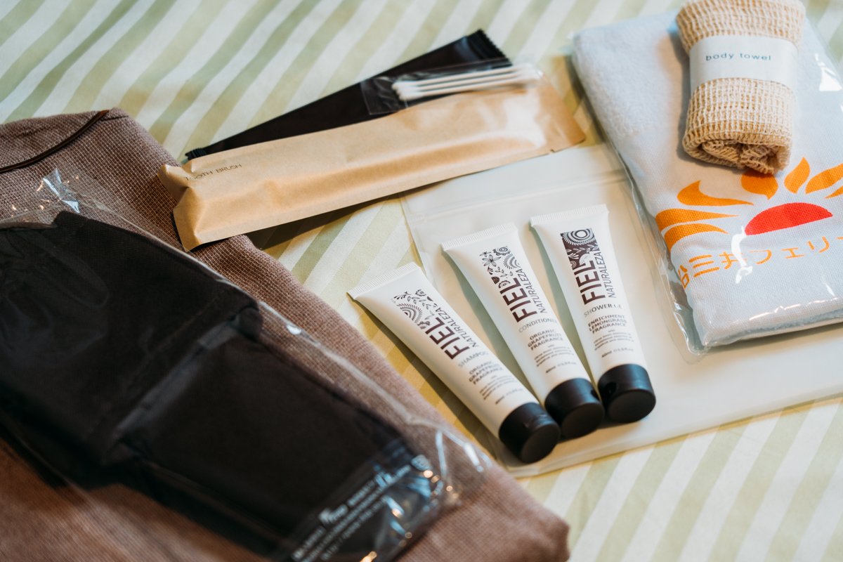 「さんふらわあ」での思わぬハッピーポイントは、個室のお部屋にはアメニティがしっかりあったこと……!そのほか、バスタオルやパジャマも用意されているので、荷物を減らせるのもうれしい♪実は、このあたりの心配からアメニティを持参してしまったのですが、シャンプーやトリートメントのオーガニックなかわいい見た目に惹かれ、結局はフェリーのものを使いました!とってもいい香り&使い心地もよく、ここでも思わぬ癒やしに遭遇。