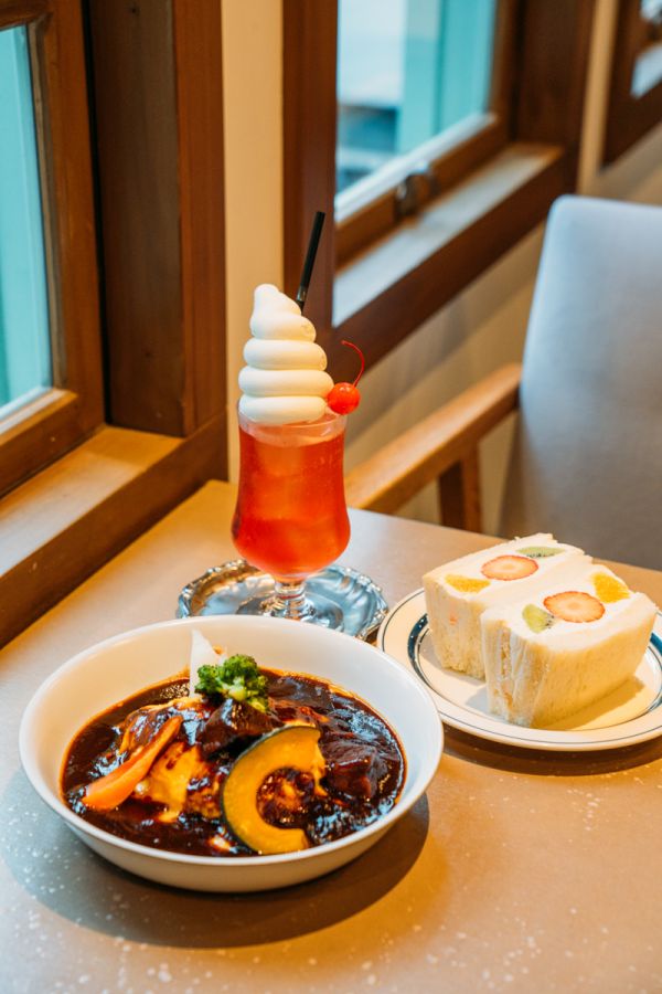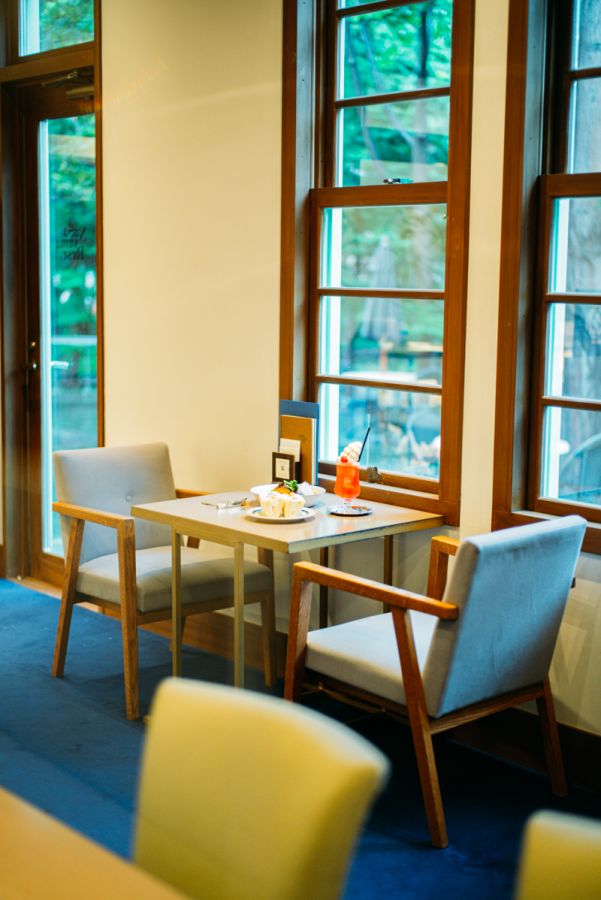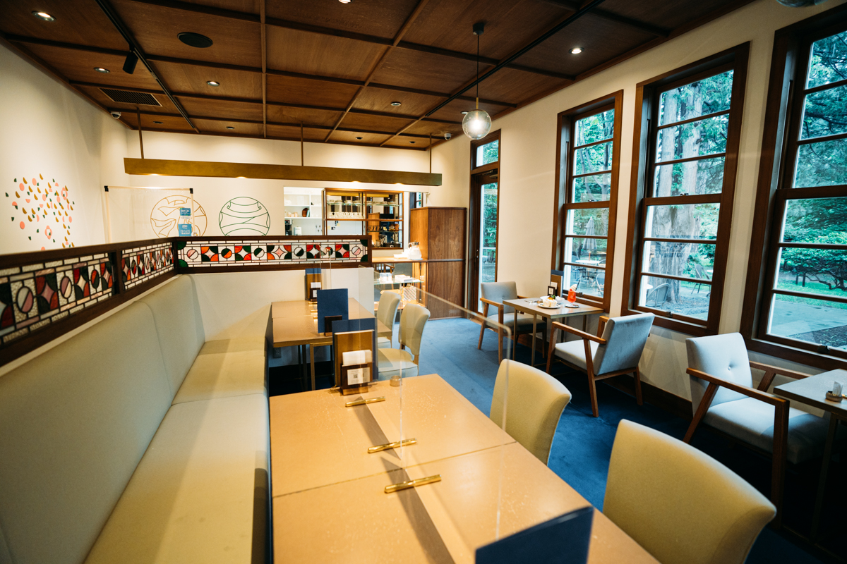 こちらのカフェ「和洋折衷喫茶 ナガヤマレスト」は、明治前半期に建てられた歴史的な建物「旧三菱鉱業寮」のなかにあって、当時では珍しい和洋折衷のモダンなデザイン。そんな歴史もあってか、お店のメニューは建物の雰囲気と同じ和×洋がコンセプトなのだそう。春には桜、夏には豊かな緑が店内からでも楽しめます。