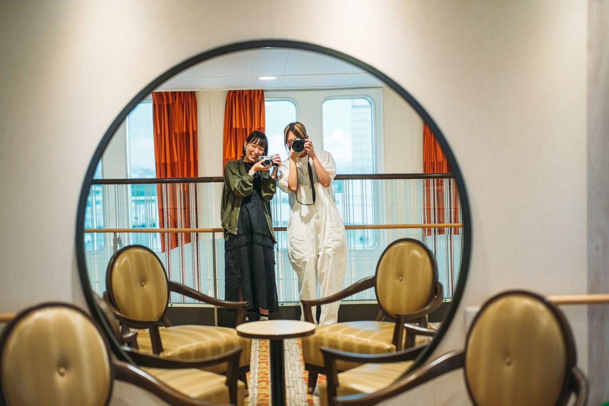 散策を続けると、6階の共有スペースに映えそうな真ん丸の鏡が……!ふたりで並んで、左右の余白が均等な構図になるように撮影してみました。シックなインテリアと背景の赤い差し色がとってもかわいいですよね。「さんふらわあ」では、海以外の映えスポットもたくさんあるので、楽しみながら探してみてください♪