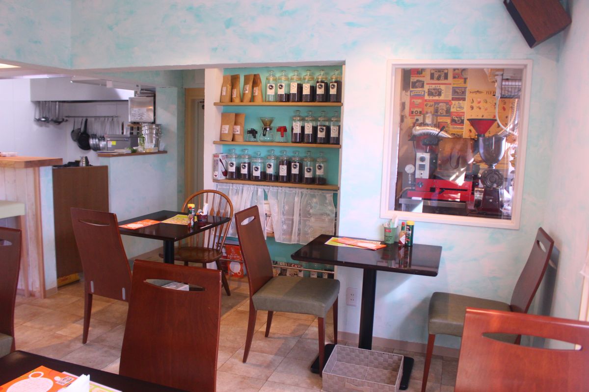 新しいお店は、かつて郵政省の社宅だった建物の1階。内装はオーナーの坂部さんが一から手がけたそうで、前のお店で使っていたイスやテーブルなどをそのまま利用しているとのこと。ライトブルーの壁が「oasis」のようにさわやかです。