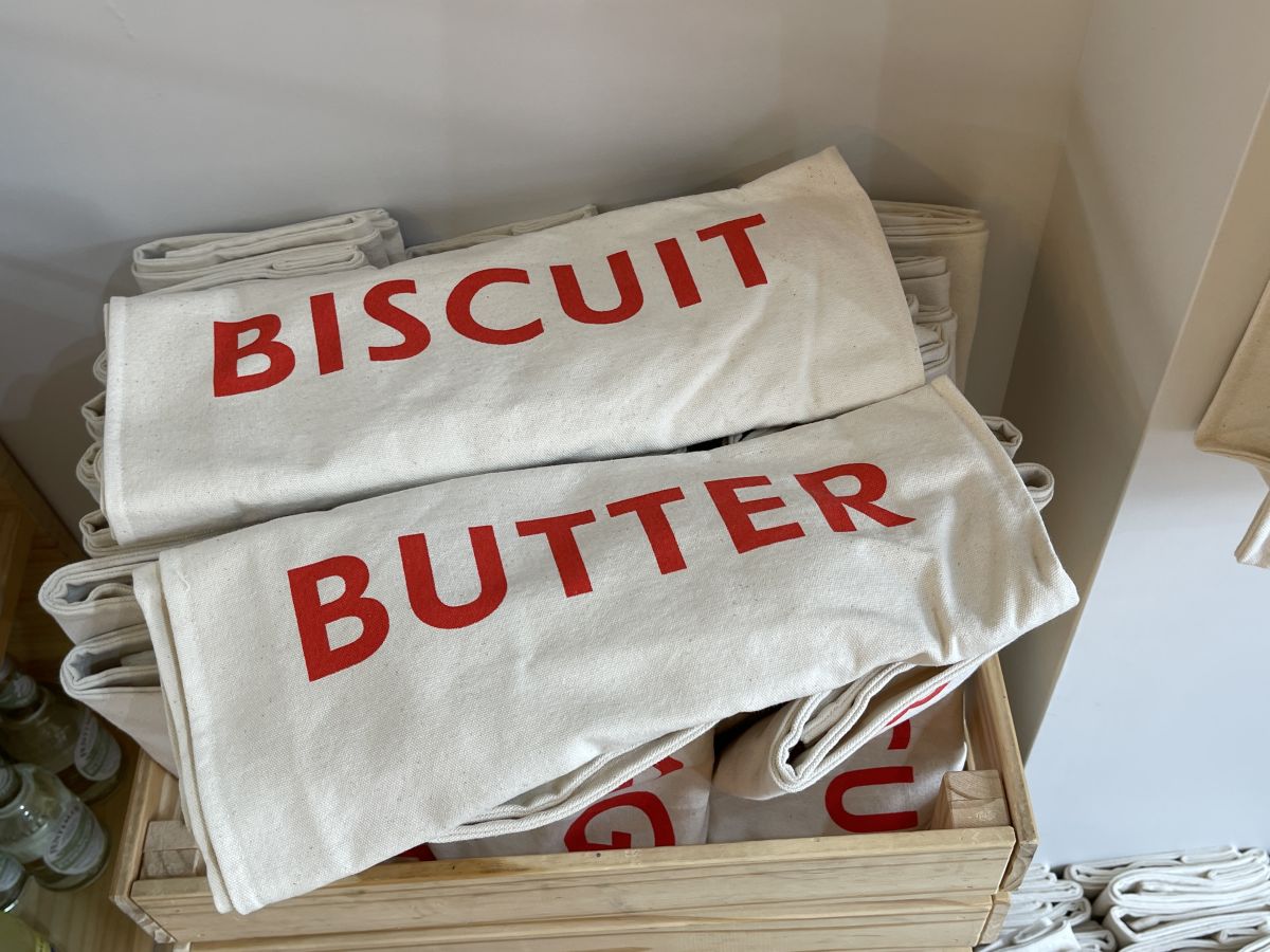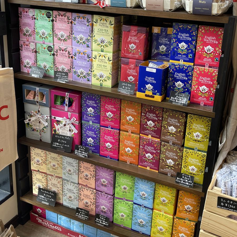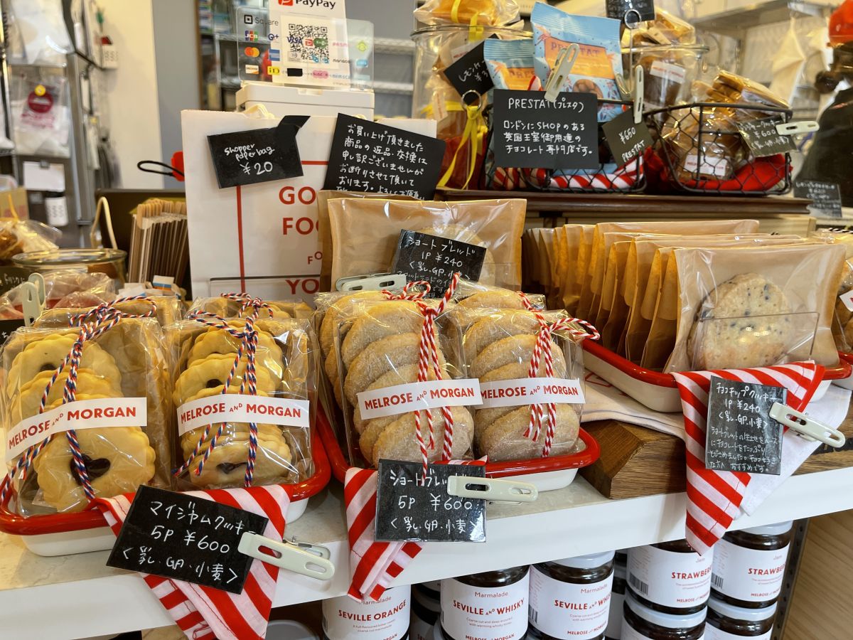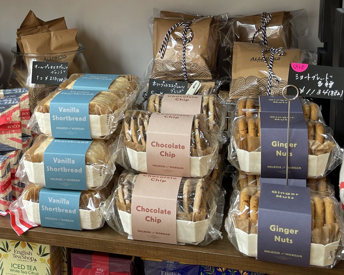 棚の上にあるパッケージングされたクッキーはイギリスから仕入れたもので、イギリスらしい甘めの味わいを楽しめますよ。