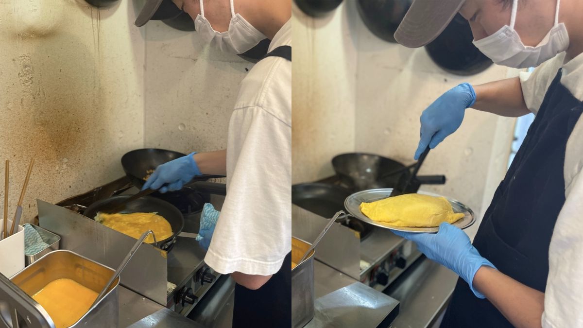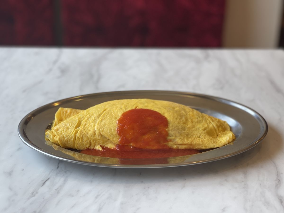 王道感をさらに引き立たせる真っ赤なケチャップは、強火にかけて酸味をとばし、白ワインを加えています。中のケチャップライスには隠し味にからしを入れることで、洋食屋さんで食べる本格オムライスを再現!