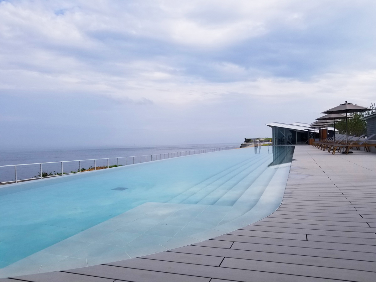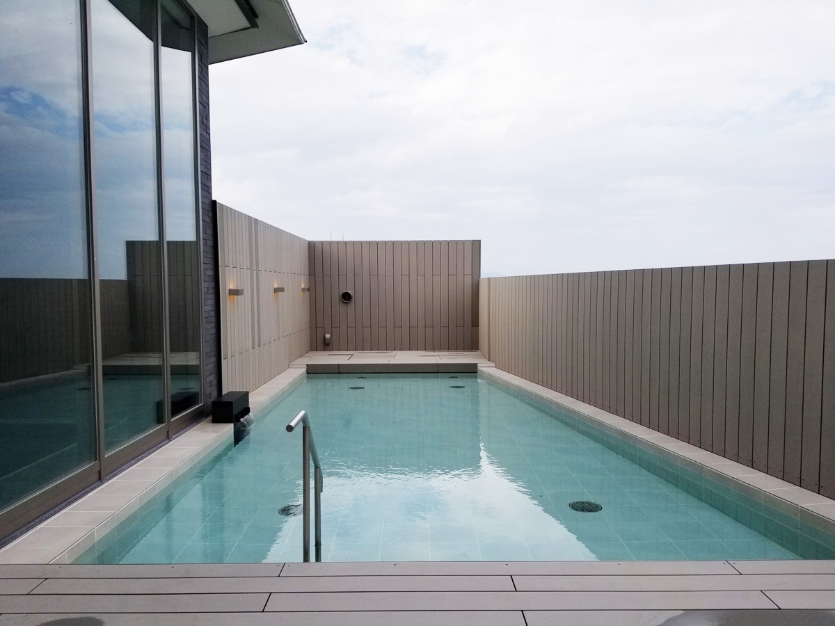 幅約45mの湯船に浸かると温泉の水面と大阪湾の海面が揃って見えるインフィニティ風呂で、内風呂、露天風呂と同じ源泉を使っており、温度は32度ほど。ずっと浸かっていたい気持ちよさです。