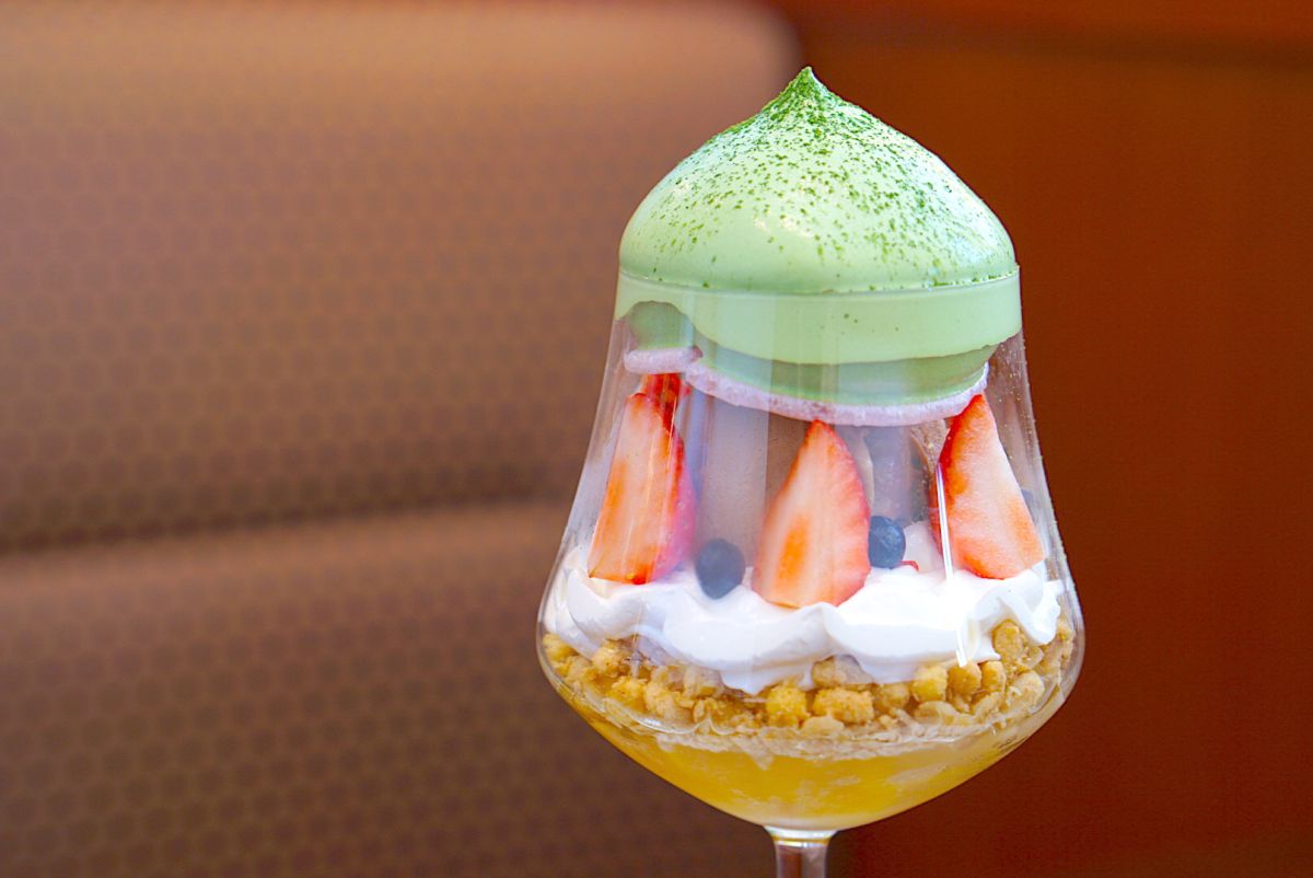 抹茶フローシークリームはふわふわの泡のようなクリームで、まさに“食べる抹茶”。ほどよい苦味と茶葉の香りが口いっぱいに広がります。その下にはコーヒーアイスにイチゴ、サクサク食感がアクセントのフレークに、オレンジソースやレモンゼリーと、とにかく具材が豊富!見た目の美しさはもちろん、食べていて飽きないひと品です。