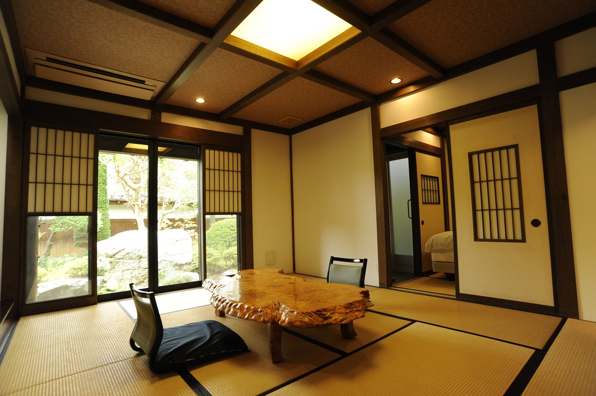 こちらは別邸にある隠居の間。日本庭園を眺める10帖の和室にベッド、半露天風呂付きの客室です。純和風の趣ながらベッドが用意されるなど、現代の快適さを兼ね備えています。風呂上りに縁側で夕涼みするのも心地よいひととき。