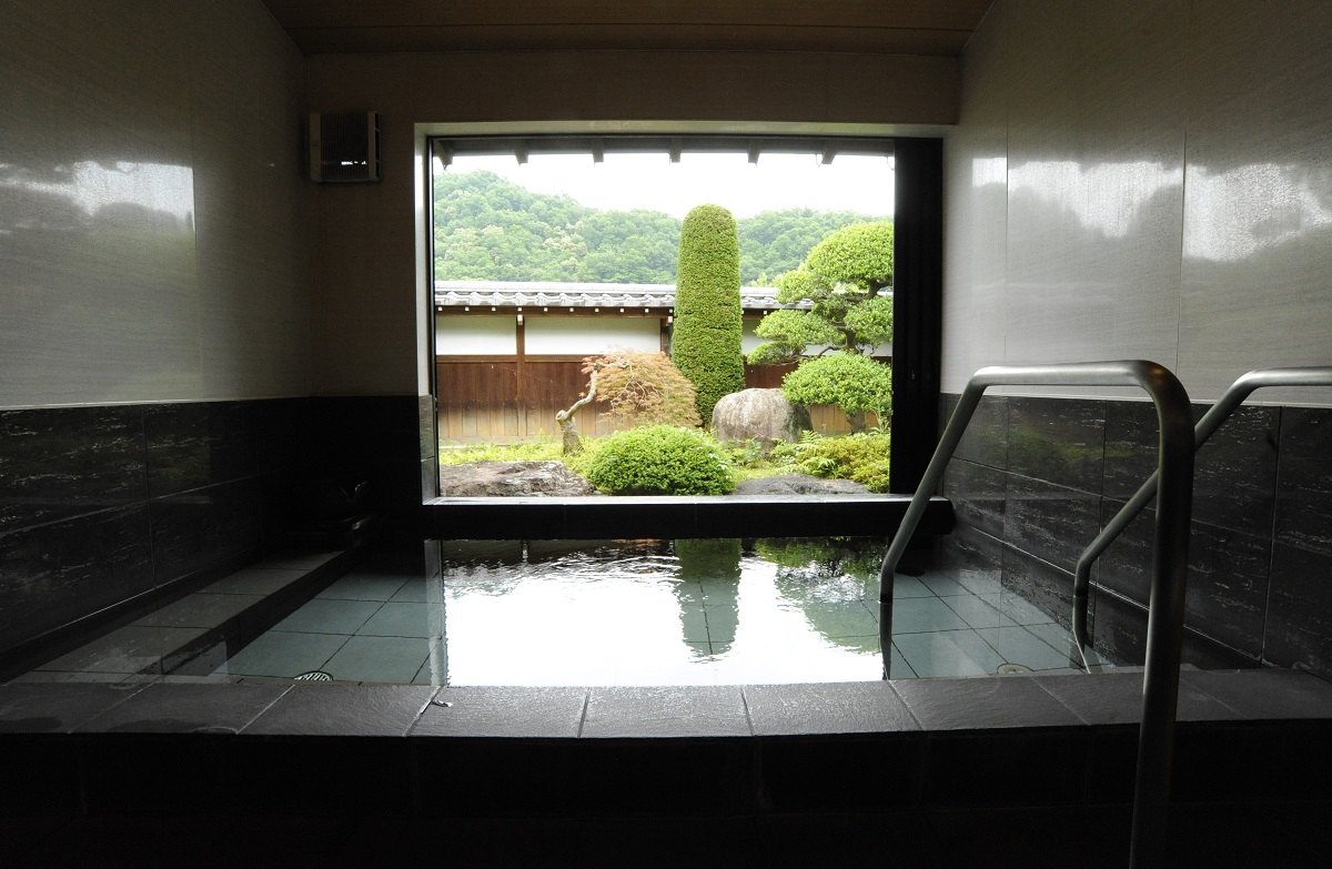 大浴場はなく、風呂はすべて貸切です。薪で湯を沸かす五右衛門風呂のような大釜風呂や広々とした湯船が自慢の庭園風呂などでは、窓から庭園越しに千束峠まで見渡せ、季節の移ろいを湯に浸かりながら楽しめます。良質なアルカリ性の温泉で日々の疲れもすっきりしますよ。全6室に対して貸切風呂は4つですが、風呂の付いた客室もあるので、いずれものんびりと湯を楽しめます。