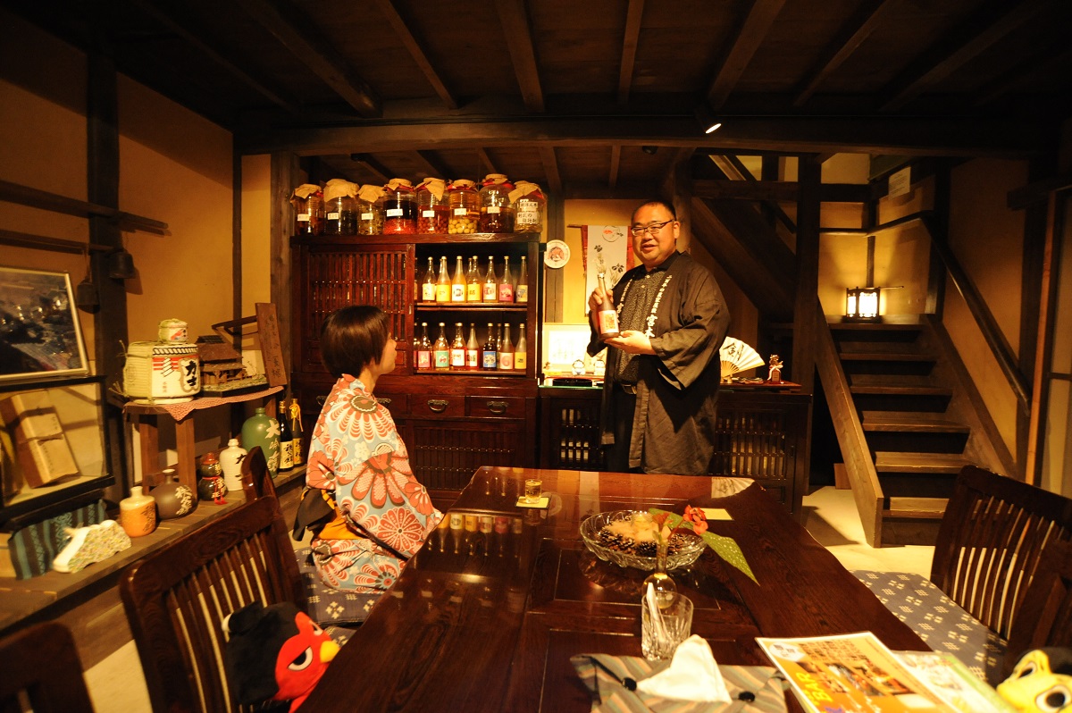夕食前には「蔵バー」で食前酒をいただきます。宮本家の庭や秩父の山で採取してきた木の実や果実を使った50種類ほどの自家製果実酒の中から好きなものをチョイス。カリンや梅、イチゴ、黒文字、マタタビなど…。のど越しの良さにもう一杯と言いたくなりますが、35度のアルコールに漬けているので、食前酒は一杯にしておきましょう。