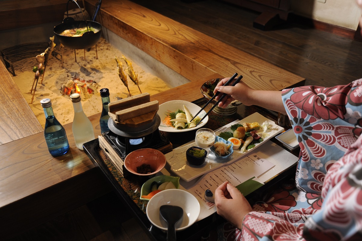 囲炉裏の串焼きと地酒を楽しむ夕べ