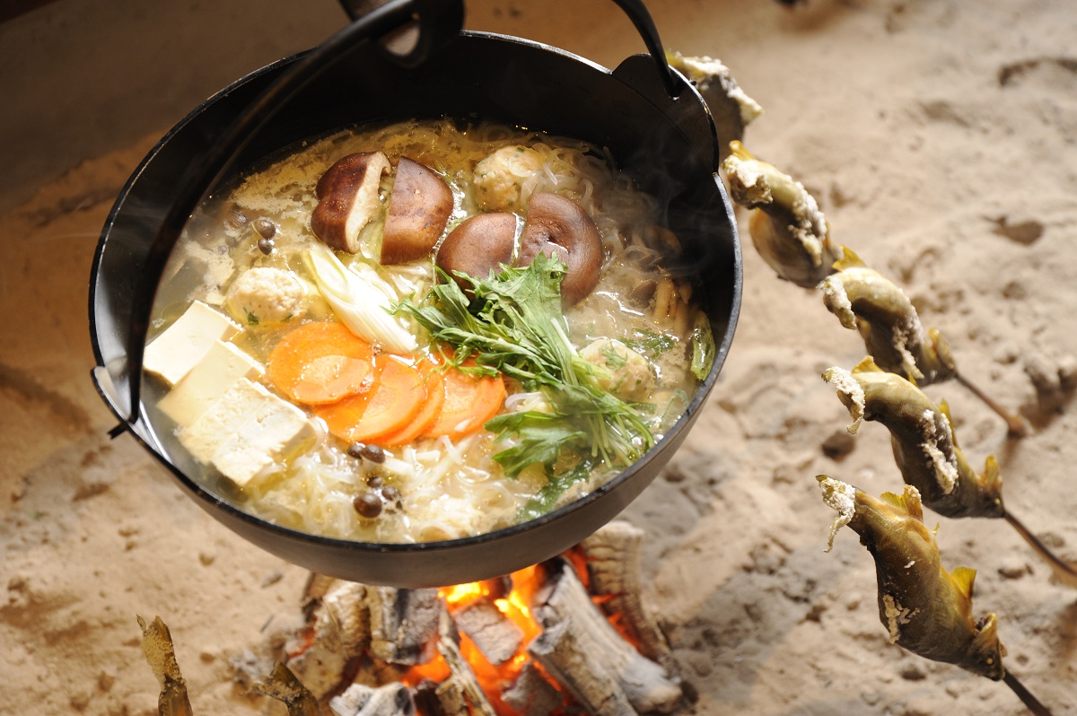 夕食のメイン料理は元力士である当主直伝のちゃんこ鍋。この鍋を食べるためにここを訪れる人も多いそう。たっぷりの野菜や団子などからの旨味が溶け込んだスープは、何とも例えようのないまろやかかつ深い味わい。ほっこりと温まりつつ、「二百年の農家屋敷 宮本家」ならではの味に心もおなかも満たされます。