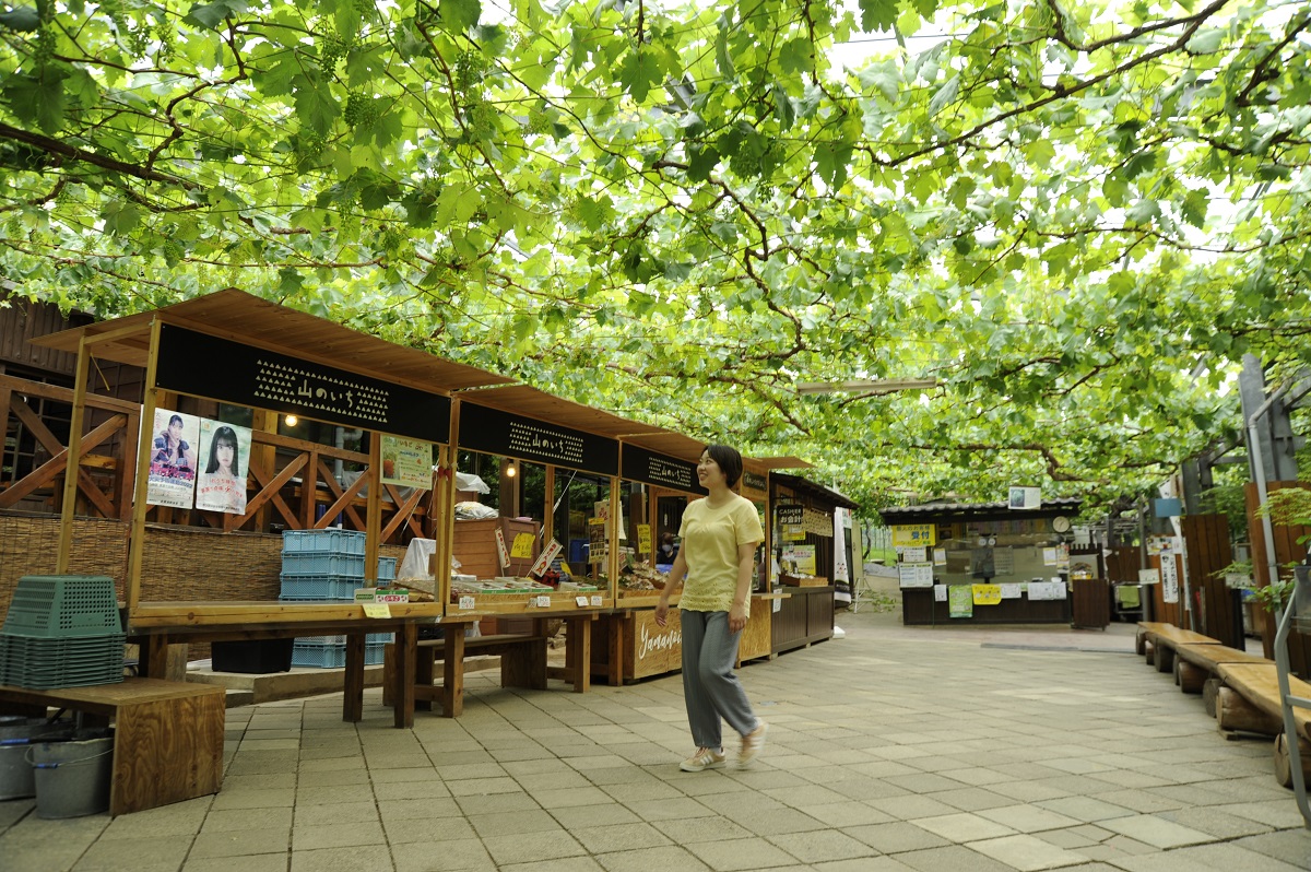 東京ドーム1個分の広さを誇る「小松沢レジャー農園」。ぶどう狩り、いちご狩り、シイタケ狩り、さつまいも掘り、マス釣り・マスつかみ取り、手打ちそば・手打ちうどん体験など、季節によってさまざまな体験ができる農園です。甘い匂いに誘われて園内へ。夏にはブドウ棚にたわわに実るシャインマスカットや巨峰などが観光客を出迎えてくれます。