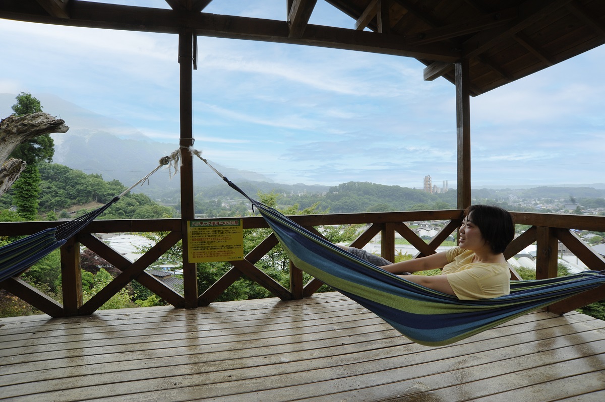 園内をぐるりと回るハイキングコースもあり、秋には千本以上の紅葉が色づいて赤く染まった山林を散策できます。ハイキングコースの途中にあるハンモックハウスからは、秩父を代表する山、武甲山が眺められます。旬の素材を食べて、歩いて、ハンモックで風に吹かれながらゆったりと過ごす。途中でお昼寝も可能なゆるいハイキングを満喫してください。