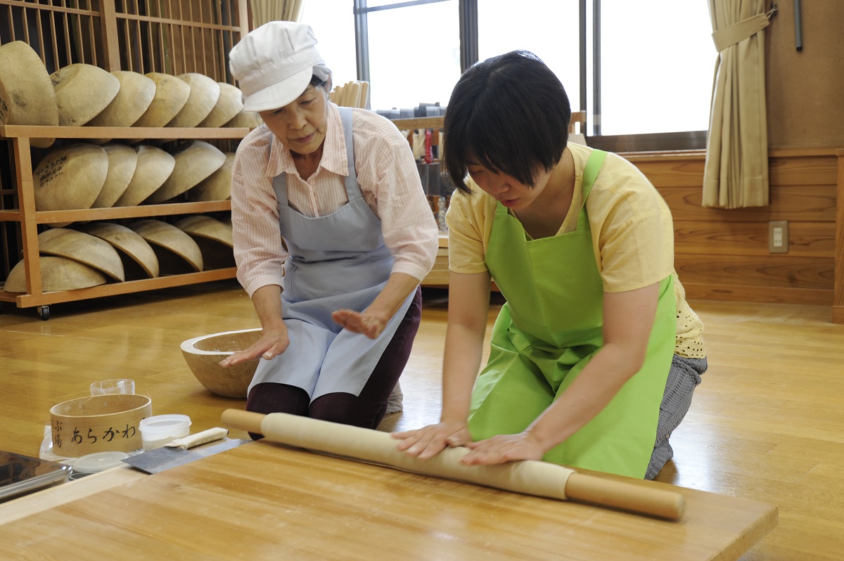 「あらかわ亭」でそばを食べたあとは、そば打ちに挑戦。秩父では客人をそばでもてなす文化があり、今でも人が集まる席には家庭で手作りするそばが欠かせないそう。今日の講師である井上さんもお母様が作る様子を見よう見まねで覚え、そばを打てるようになったそうです。おいしいそばを作るポイントは「よくこねること」。つやとねばりが出るまで根気よくこねることで、コシのあるそばに仕上がります。