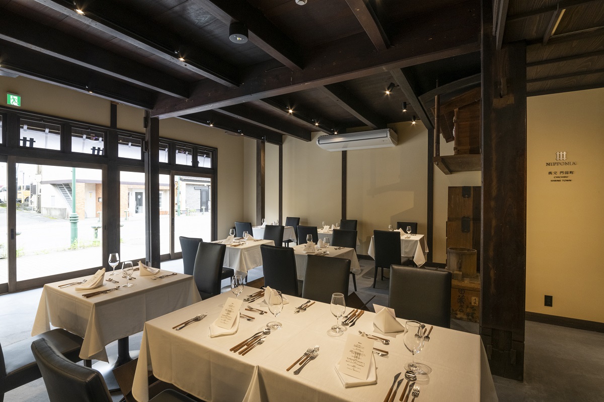 「NIPPONIA 秩父 門前町」の1階、通りに面した「Restaurant MARUJU」は、宿泊客以外でもランチ、ディナーともに利用できます。古民家らしいしつらえの落ち着いた店内で食事を楽しむ至福の時間。レストランで使用する食器などは地元秩父で活躍する作家のもの。受付カウンターの壁にある檜のロゴも秩父の職人作です。