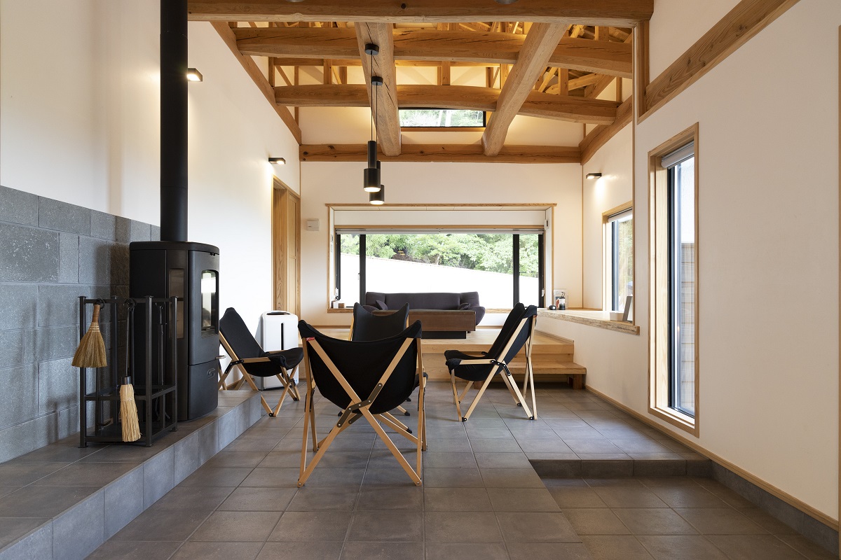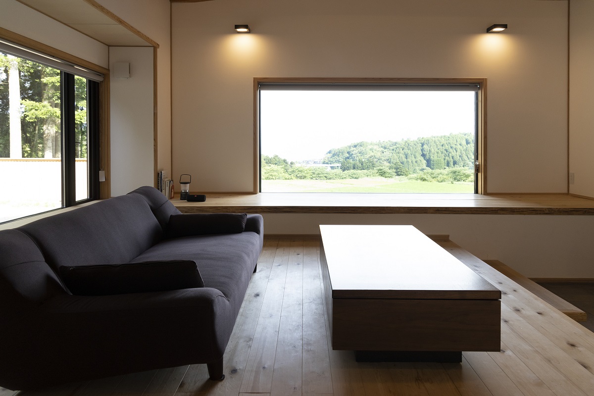 小上がりのソファから眺める風景は、窓枠で切り取られ、より一層絵画のような美しさが際立ちます。空や緑の色、雲の形など、刻々と移ろう自然の表情に気づかされるのもこの宿ならでは。ワンフロアのため、寝室や居間からもふと目に入り心を和ませます。