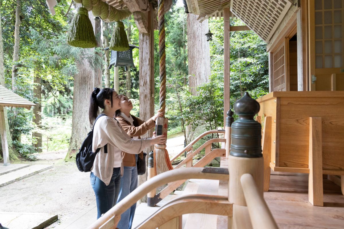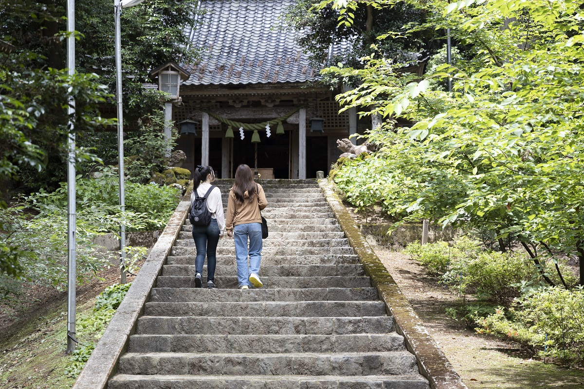 ひと休みしてから大呑の散策へ。宿のおすすめは、集落最奥の杉林に鎮座する「阿良加志比古神社(あらかしひこじんじゃ)」を目指す所要約1時間30分の神社コース。「阿良加志比古神社」は平安時代に編纂された『延喜式』にも記載されている由緒ある社です。大呑には「熊淵の長者」という伝説があり、その話に登場する長者がこの社に祭られているそう。戦国時代に上杉謙信が七尾へ攻め入った際に兵火に遭ったため、神社についての古い記録は残っていないそうですが、そのエピソードからも、この神社の歴史に思いを馳せることができます。