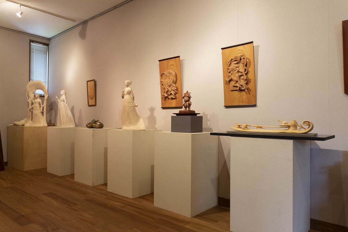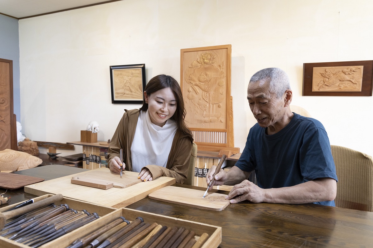 神社へ向かう途中に、木彫制作の工房「たきかわ木彫」に立ち寄りました。こちらで瀧川夫婦が創作活動をされています。富山県の井波で木彫刻を学んだご主人の瀧川千春さんと、日展作家に師事した奥様の佐智子さんの作品を鑑賞させてもらううちに、木に触れてみたくなって、木彫のトレー作りに挑戦しました(2000円、材料費別)。彫刻刀に触れるのは久しぶりという方も、瀧川さんが丁寧に教えてくれるので安心です。「たきかわ木彫」を訪れる際は「大呑ビレッジ」にご相談くださいね。