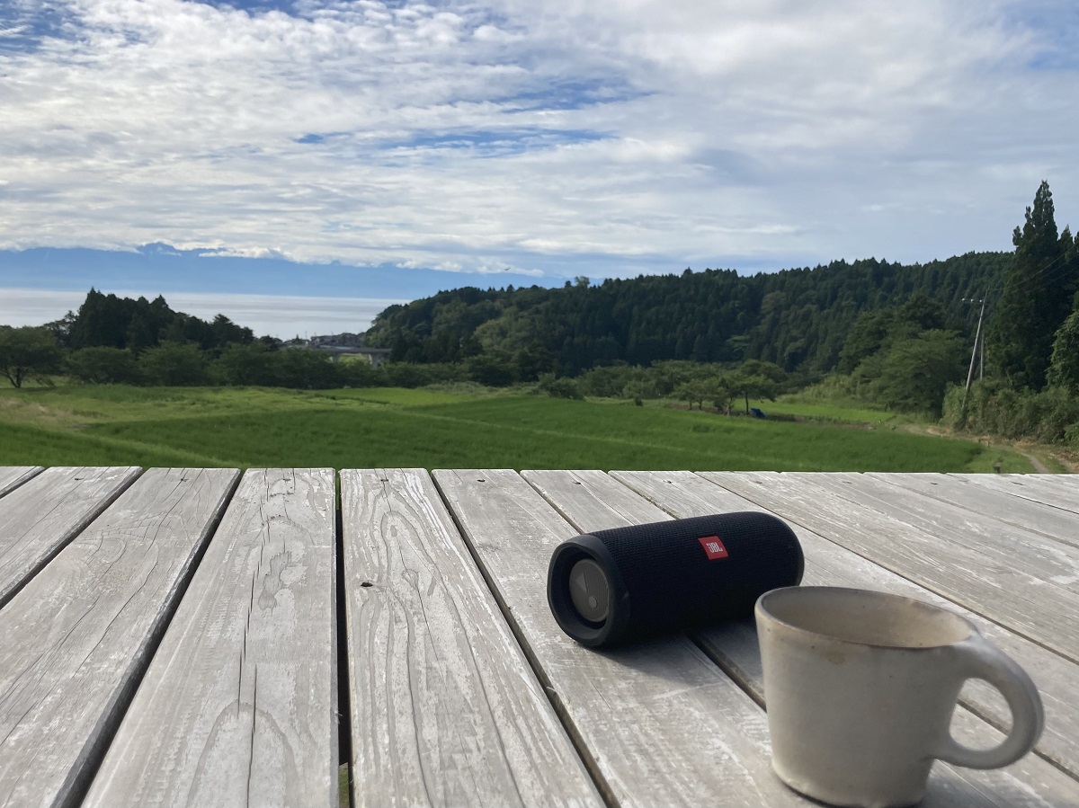宿の敷地に入ると、思わず息をのみました。三方向が山に囲まれていて扇状に視界が開けています。景色全体がまるで絵画のような美しさ。人工物がほとんど見えず、すぐそばには田んぼの緑、目の先には富山湾。天気がよければ対岸の立山連峰まではっきりと見えるそうです。今日はやや雲が出ていましたが、それでもこれだけの素敵な眺め。「大呑ビレッジ 遊心庵」は、今から30年ほど前、この場所を気に入ったとある画廊のオーナーが林を切り開いて棚田の上に建てた別荘で、リノベーションして宿になったそうです。